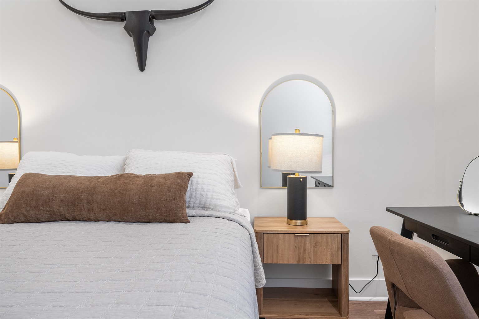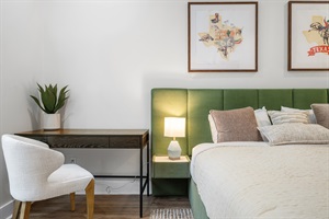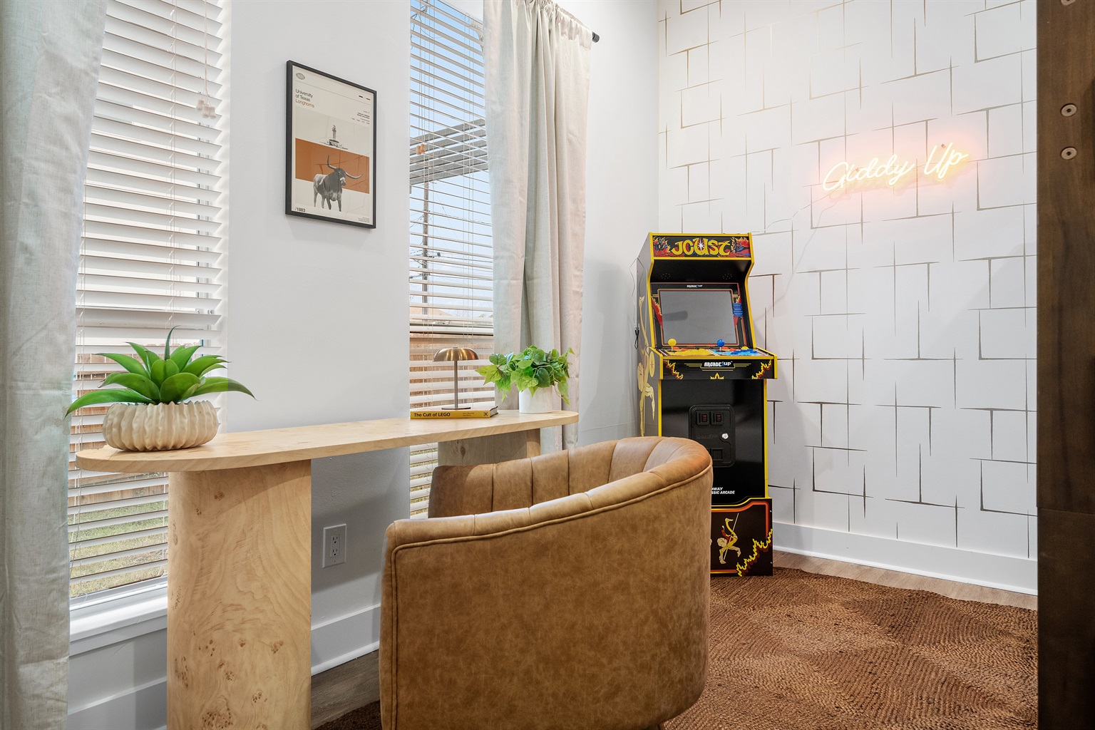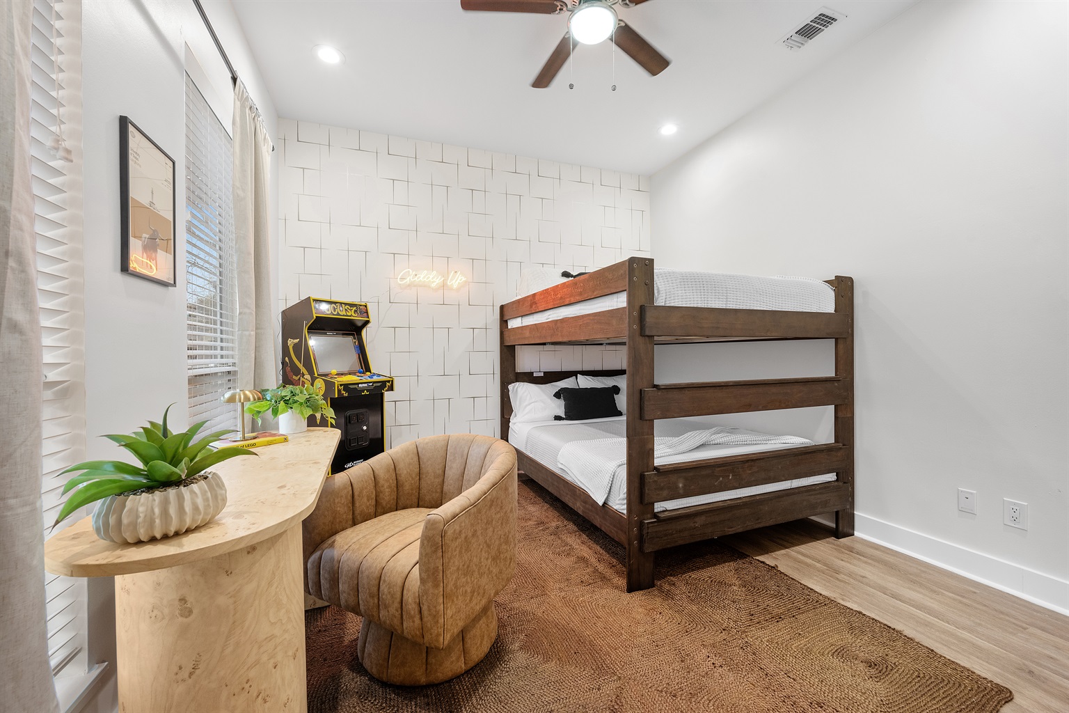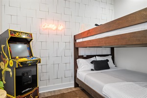 The primary bedroom is furnished with a King bed with a super comfortable mattress, a Smart TV, a ceiling fan for those hot Texas summers and large walk-in closet. The second bedroom has a queen bed, a workspace and a smart TV as well. The third bedroom is equipped with a Queen over Queen bunk bed with a workspace, and an arcade.