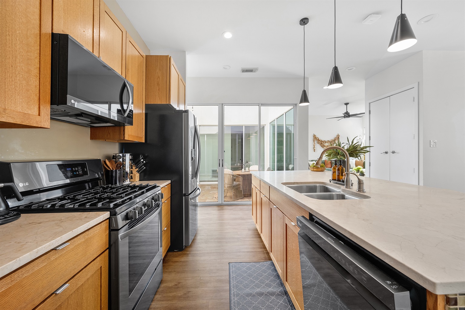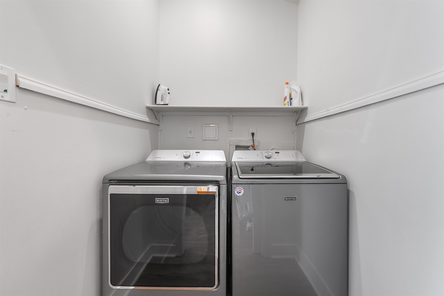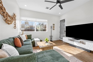 The fully stocked kitchen is fully equipped with everything you need to cook a great meal, including basic seasonings, olive oil, pots/pans and table settings for 8. Appliances include a coffee maker, microwave, and toaster. The living room includes a large comfortable couch along with a large 65" Smart TV for unwinding after a day out.
